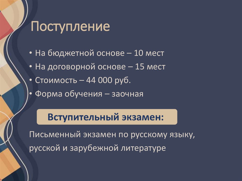 Поступление• На бюджетной основе – 10 мест