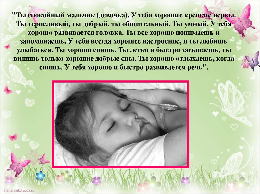 улыбаться. Ты хорошо спишь. Ты легко и быстро засыпаешь, ты