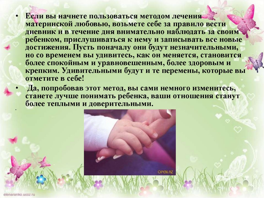 • Если вы начнете пользоваться методом леченияматеринской любовью, возьмете себе за правило вести