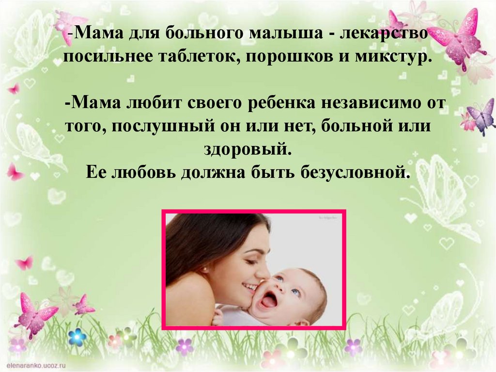 -Мама для больного малыша - лекарствопосильнее таблеток, порошков и микстур.