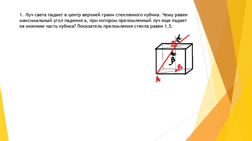 1. Луч света падает в центр верхней грани стеклянного кубика. Чему равенмаксимальный угол падения а, при котором преломленный луч еще падает