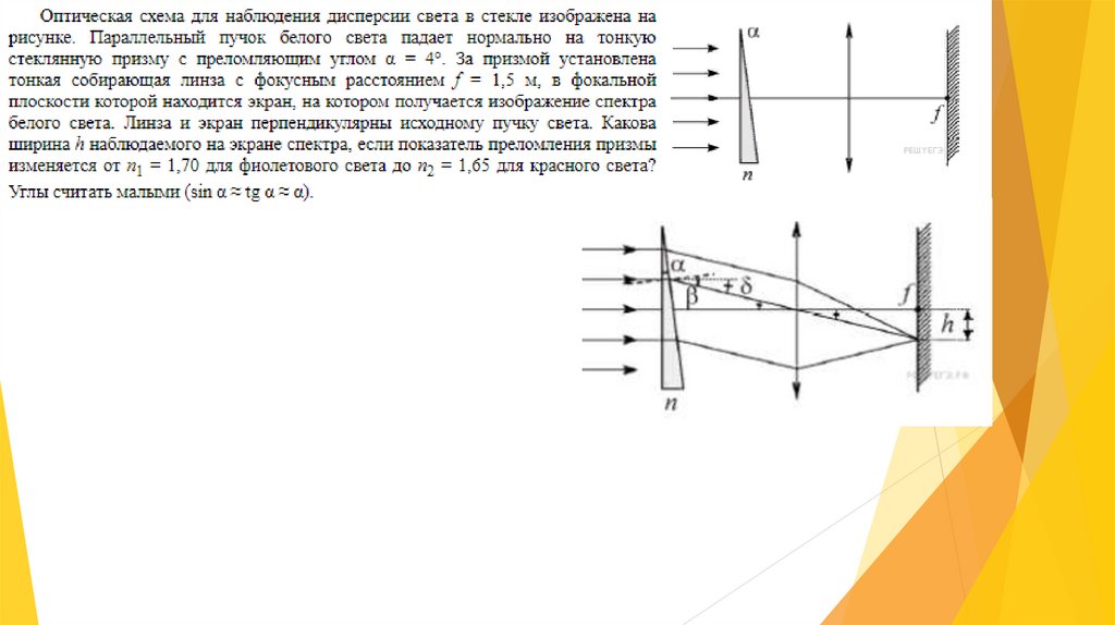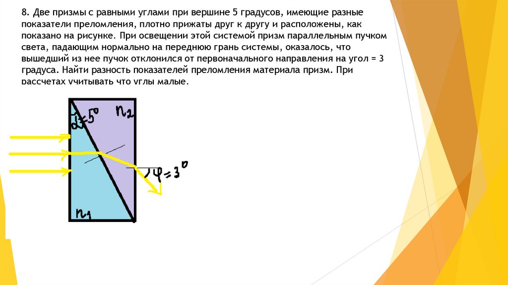 8. Две призмы с равными углами при вершине 5 градусов, имеющие разныепоказатели преломления, плотно прижаты друг к другу и расположены, как