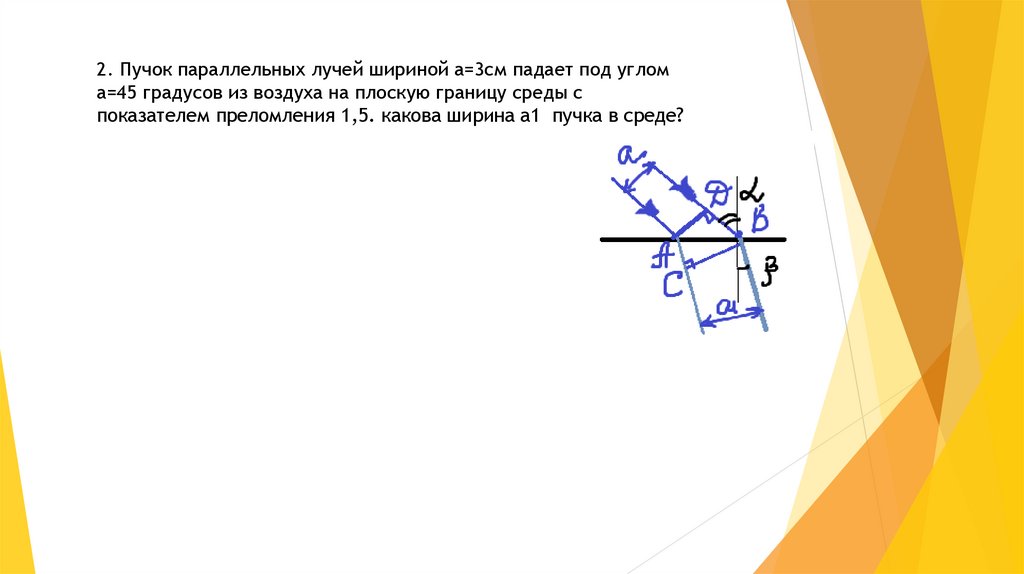 2. Пучок параллельных лучей шириной а=3см падает под углома=45 градусов из воздуха на плоскую границу среды с