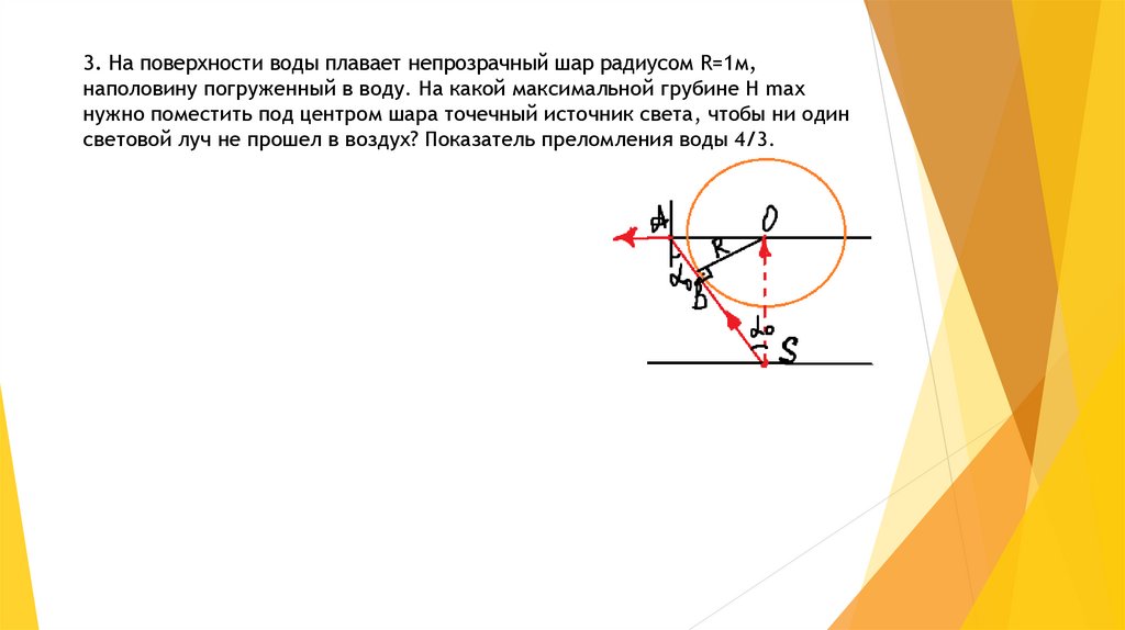 3. На поверхности воды плавает непрозрачный шар радиусом R=1м,наполовину погруженный в воду. На какой максимальной грубине H max