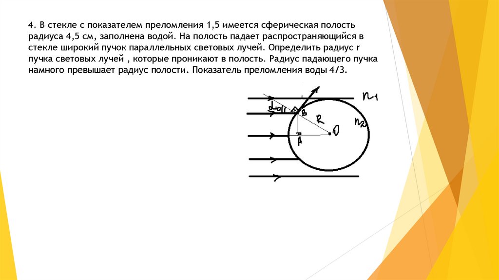 4. В стекле с показателем преломления 1,5 имеется сферическая полостьрадиуса 4,5 см, заполнена водой. На полость падает распространяющийся в