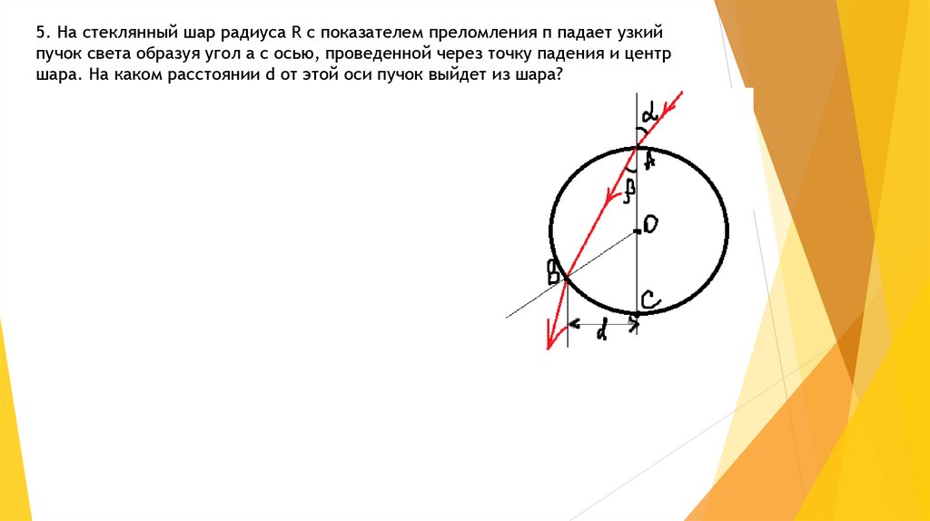 5. На стеклянный шар радиуса R с показателем преломления п падает узкийпучок света образуя угол а с осью, проведенной через точку падения и центр