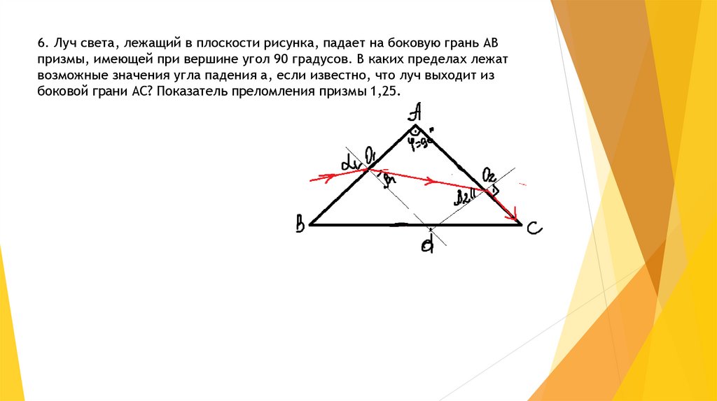 6. Луч света, лежащий в плоскости рисунка, падает на боковую грань АВпризмы, имеющей при вершине угол 90 градусов. В каких пределах лежат