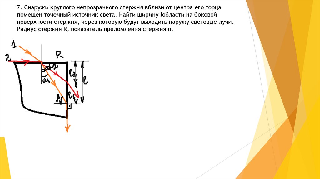 7. Снаружи круглого непрозрачного стержня вблизи от центра его торцапомещен точечный источник света. Найти ширину lобласти на боковой