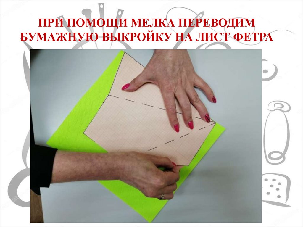 ПРИ ПОМОЩИ МЕЛКА ПЕРЕВОДИМБУМАЖНУЮ ВЫКРОЙКУ НА ЛИСТ ФЕТРА