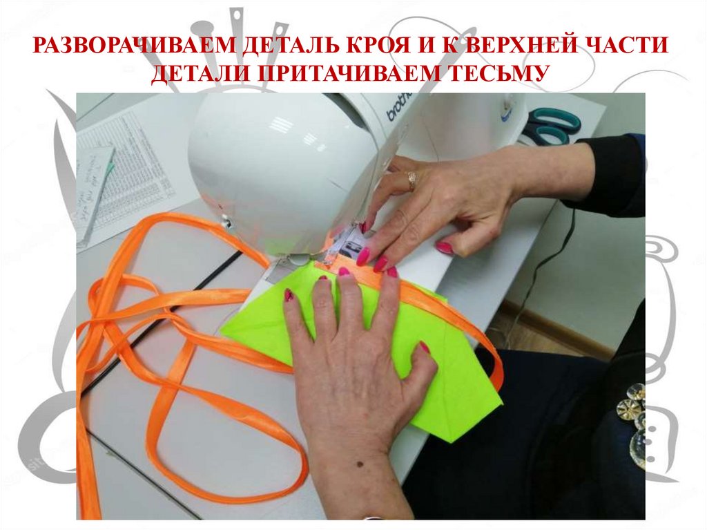 РАЗВОРАЧИВАЕМ ДЕТАЛЬ КРОЯ И К ВЕРХНЕЙ ЧАСТИДЕТАЛИ ПРИТАЧИВАЕМ ТЕСЬМУ