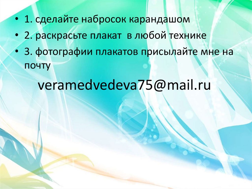 • 1. сделайте набросок карандашом• 2. раскрасьте плакат в любой технике