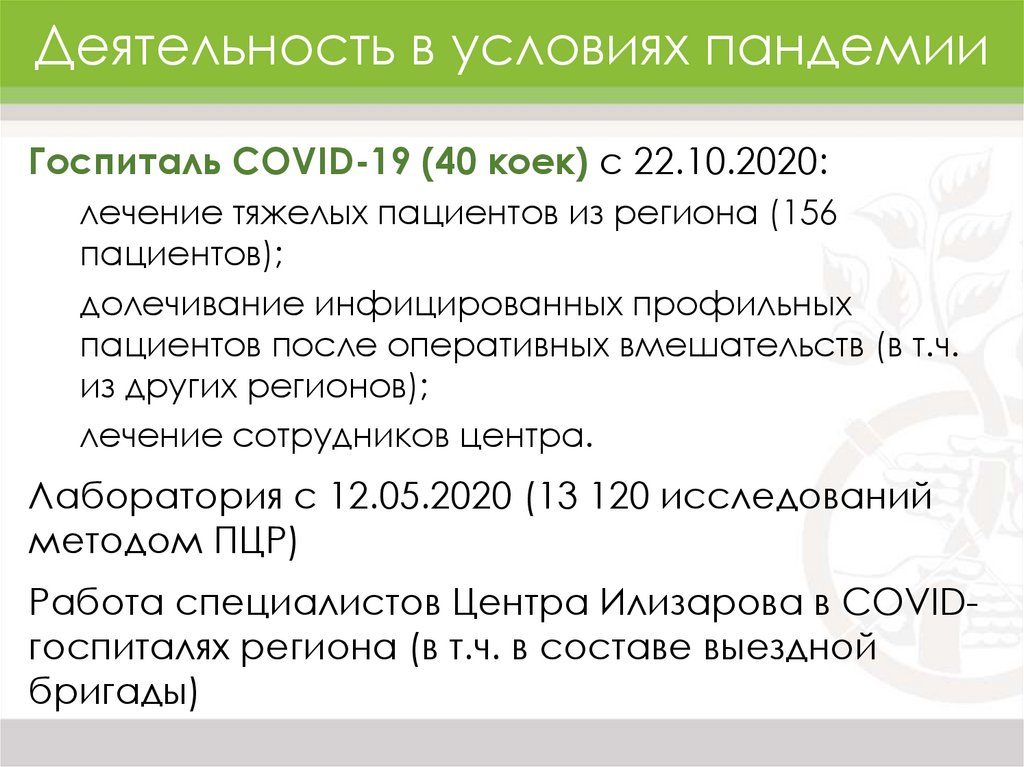 Деятельность в условиях пандемииГоспиталь COVID-19 (40 коек) с 22.10.2020: