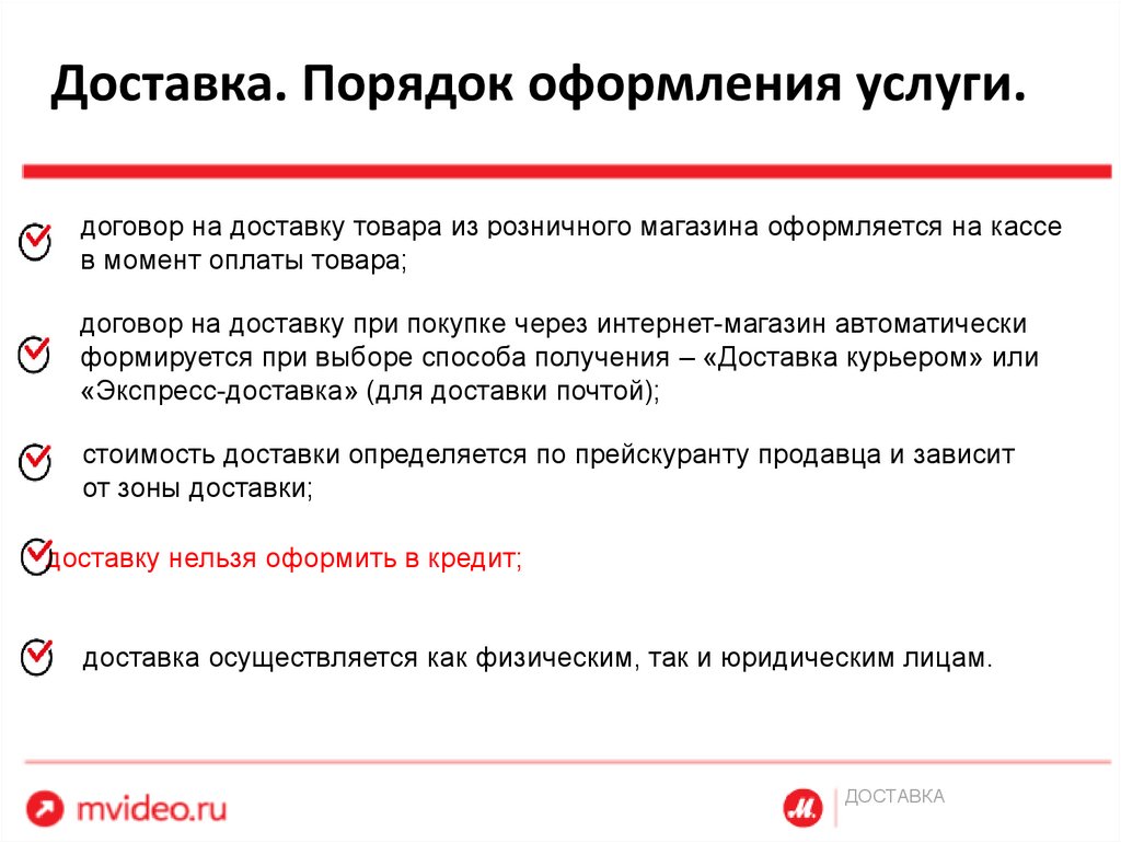 Доставка. Порядок оформления услуги.договор на доставку товара из розничного магазина оформляется на кассе
