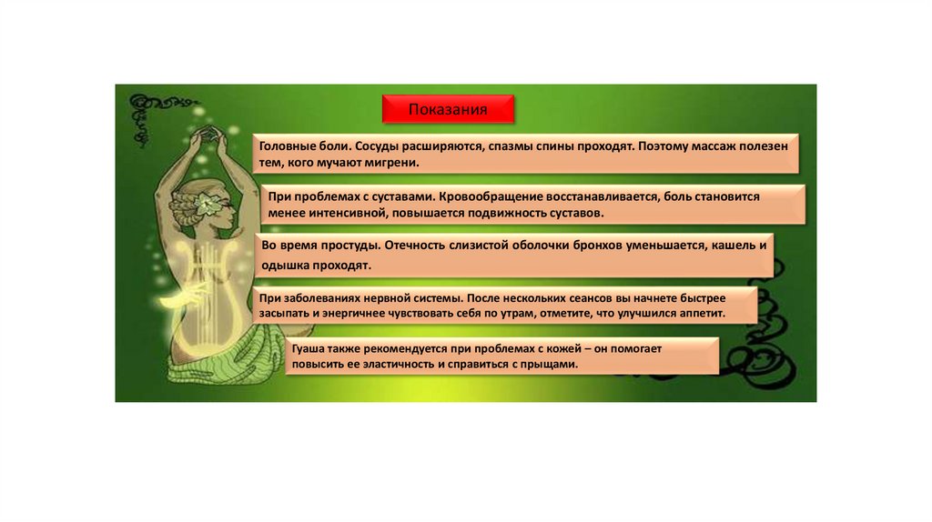 ПоказанияГоловные боли. Сосуды расширяются, спазмы спины проходят. Поэтому массаж полезен