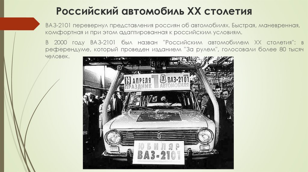 Российский автомобиль ХХ столетияВАЗ-2101 перевернул представления россиян об автомобилях. Быстрая, маневренная,