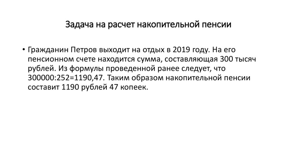 Задача на расчет накопительной пенсии• Гражданин Петров выходит на отдых в 2019 году. На его