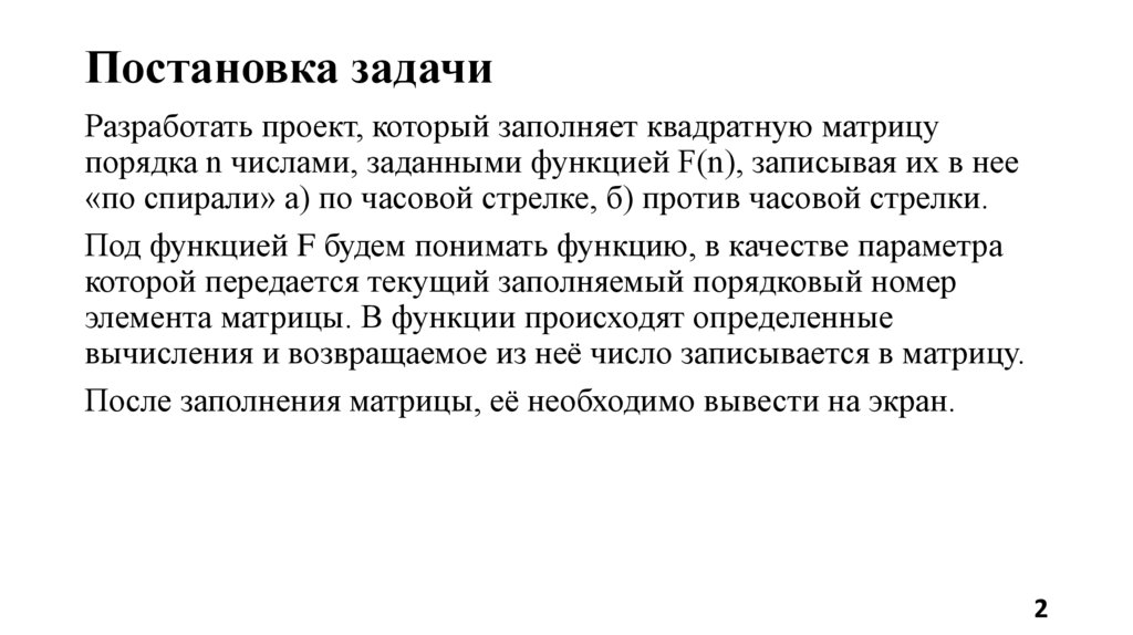 Постановка задачиРазработать проект, который заполняет квадратную матрицу