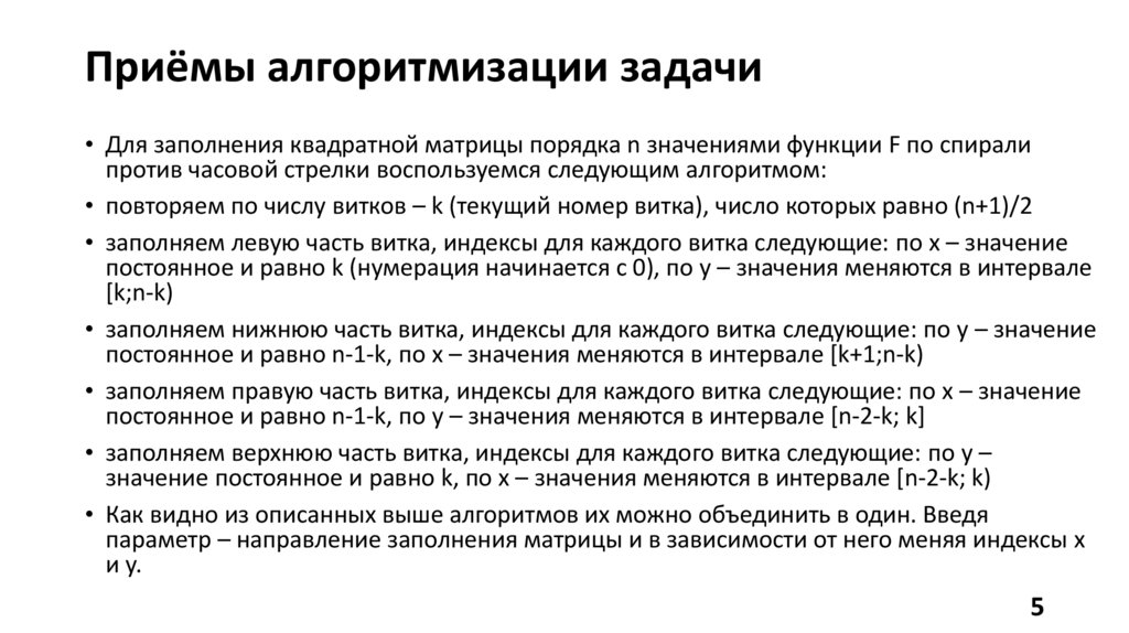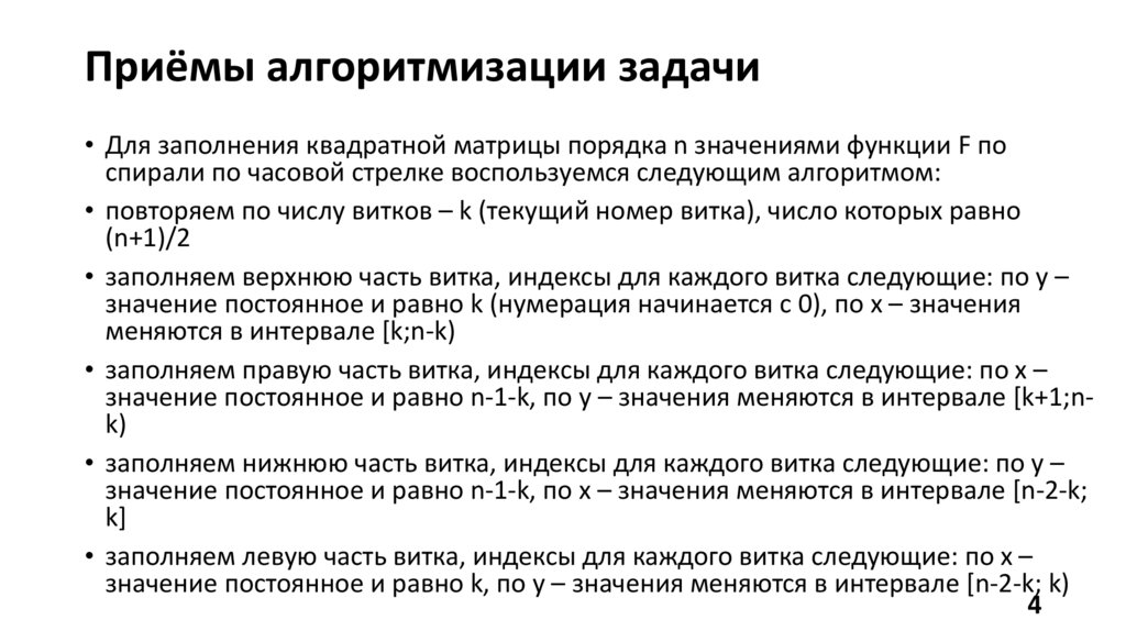 Приёмы алгоритмизации задачи• Для заполнения квадратной матрицы порядка n значениями функции F по спирали
