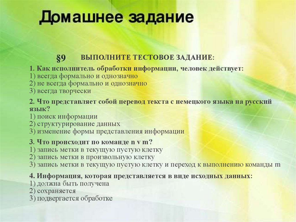 ВЫПОЛНИТЕ ТЕСТОВОЕ ЗАДАНИЕ:1. Как исполнитель обработки информации, человек действует: