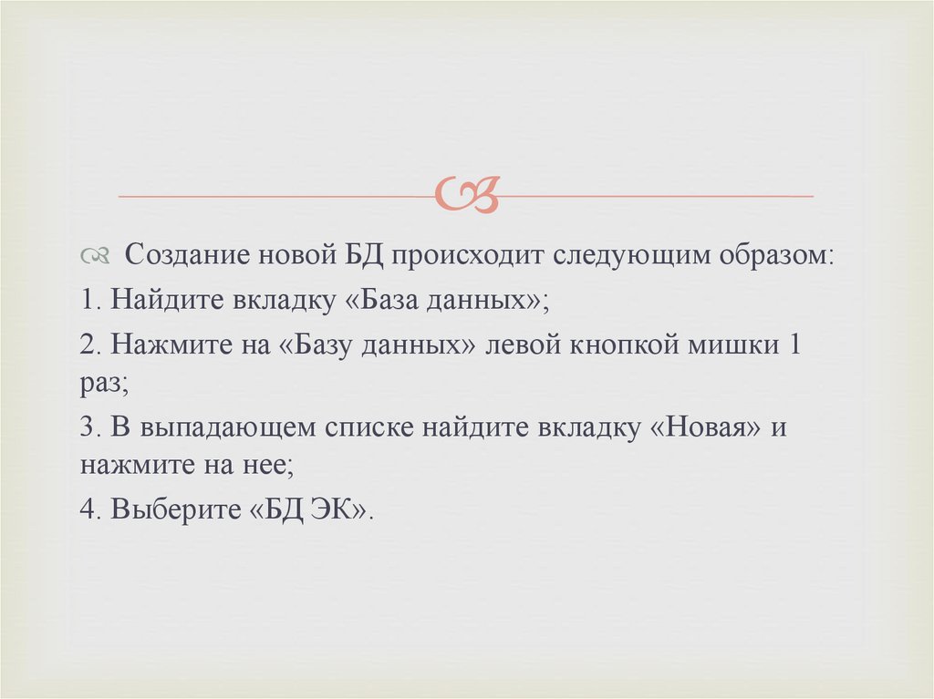 Создание новой БД происходит следующим образом:1. Найдите вкладку «База данных»;