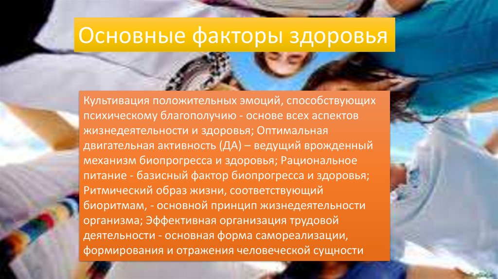 Основные факторы здоровьяКультивация положительных эмоций, способствующих