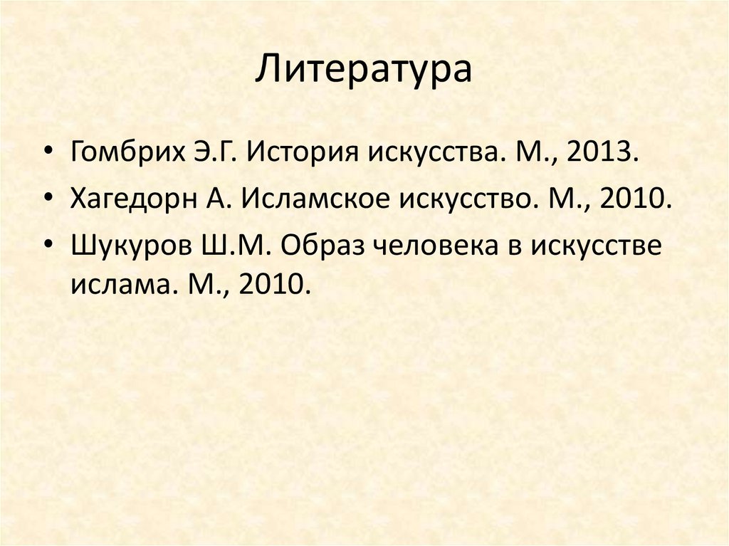 Литература• Гомбрих Э.Г. История искусства. М., 2013.