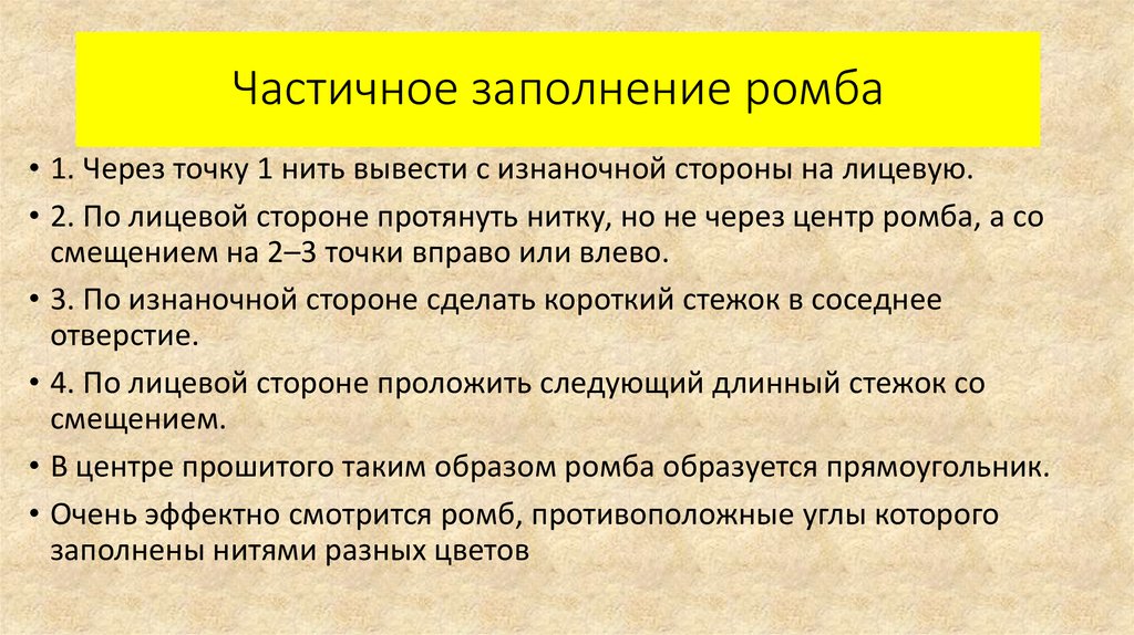 Частичное заполнение ромба• 1. Через точку 1 нить вывести с изнаночной стороны на лицевую.