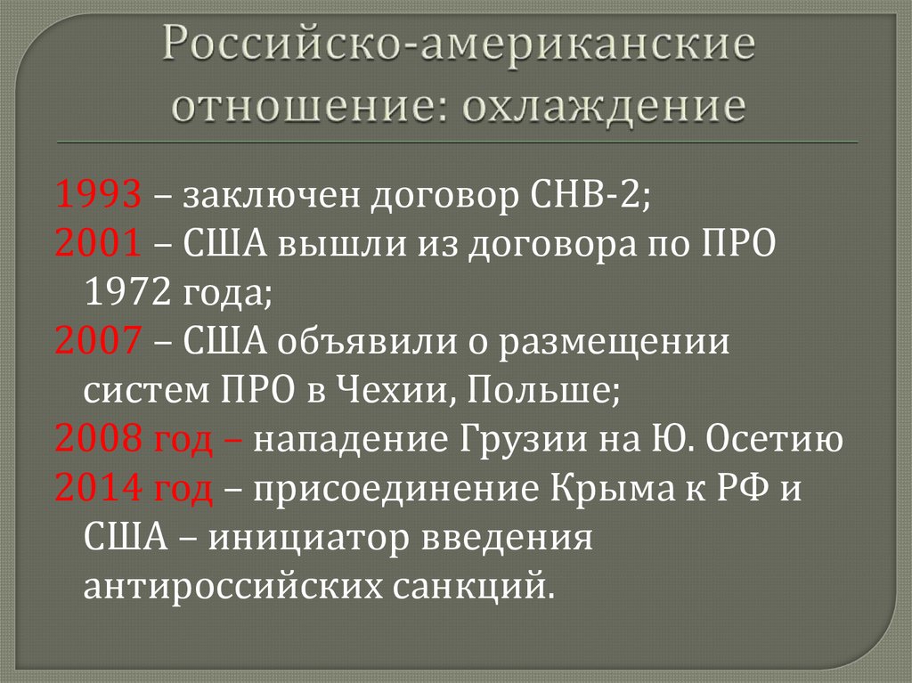 1993 – заключен договор СНВ-2;2001 – США вышли из договора по ПРО