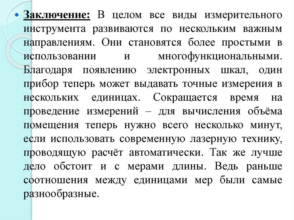 Заключение: В целом все виды измерительногоинструмента развиваются по нескольким важным