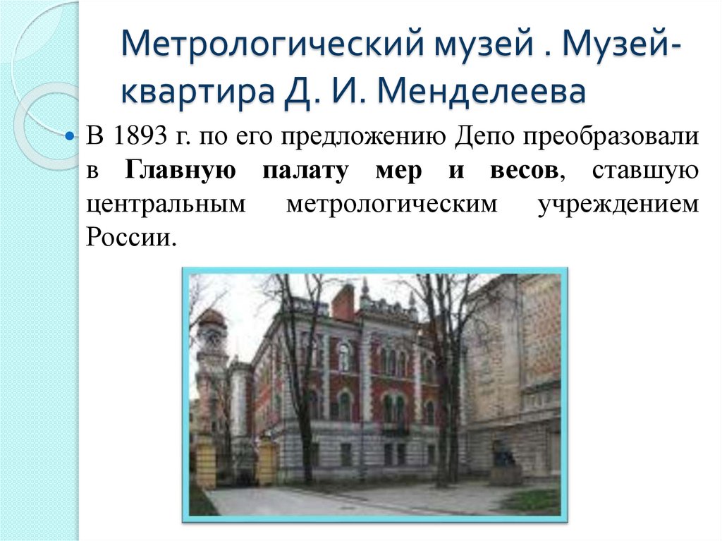 Метрологический музей . Музейквартира Д. И. МенделееваВ 1893 г. по его предложению Депо преобразовали
