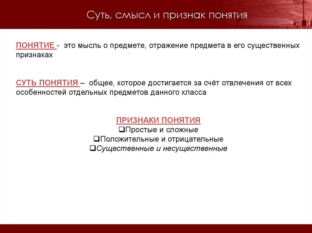 Суть, смысл и признак понятияПОНЯТИЕ - это мысль о предмете, отражение предмета в его существенных