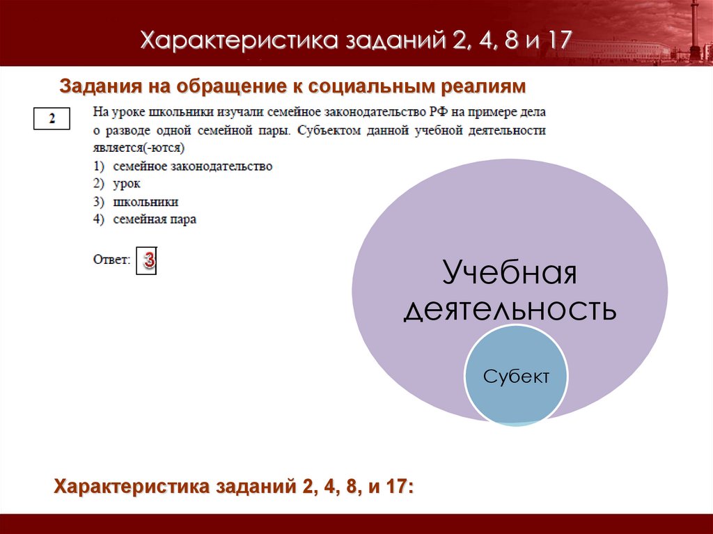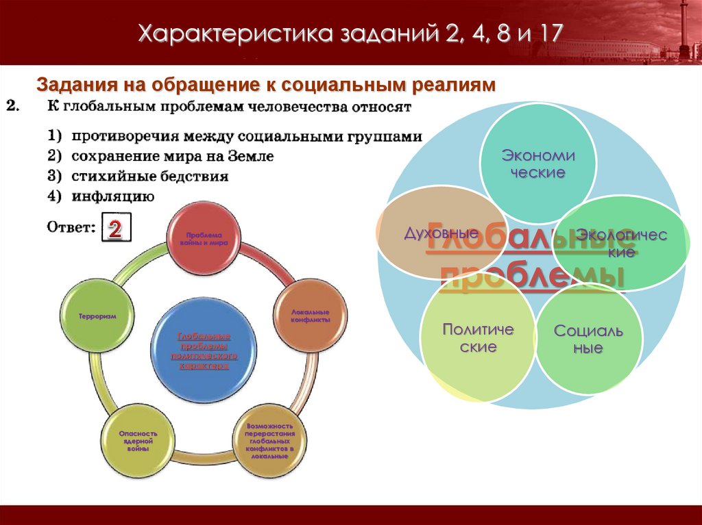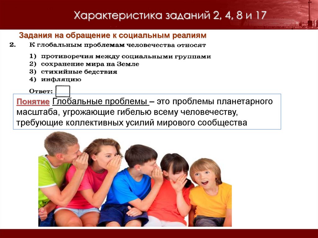 Характеристика заданий 2, 4, 8 и 17Задания на обращение к социальным реалиям