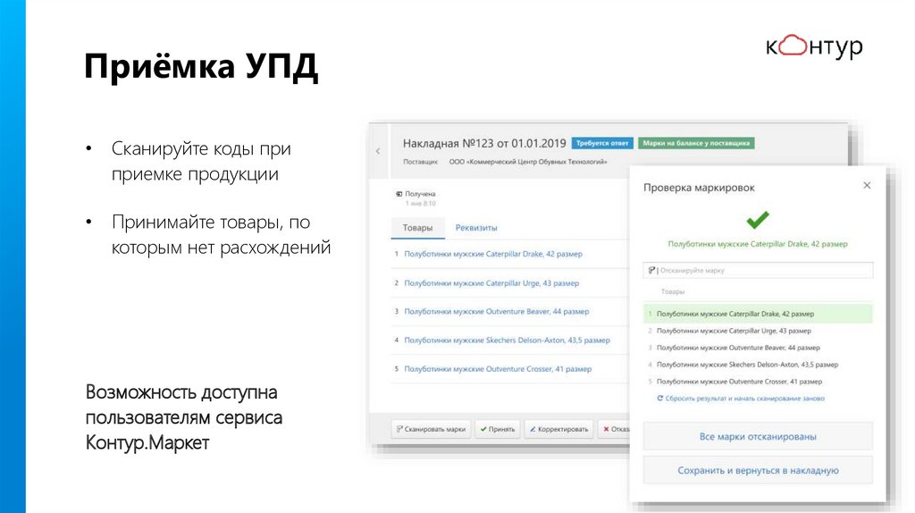 Контур.Маркет• Принимайте маркированный товар через УПД: