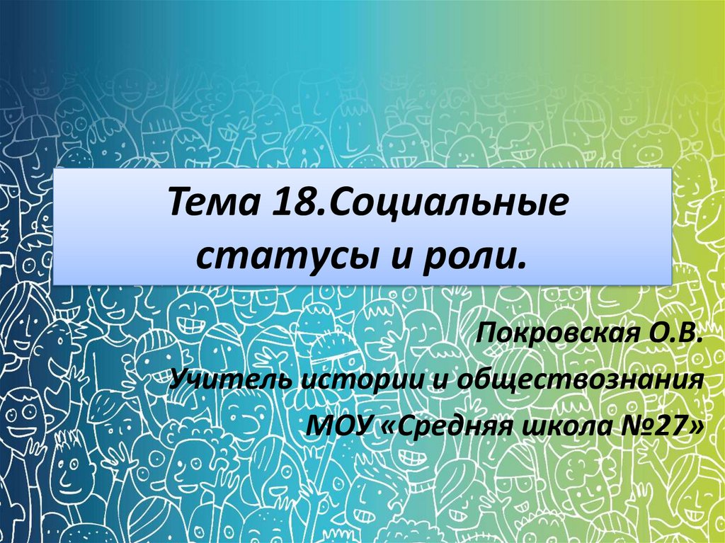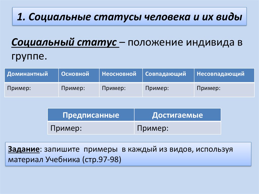 1. Социальные статусы человека и их видыСоциальный статус – положение индивида в