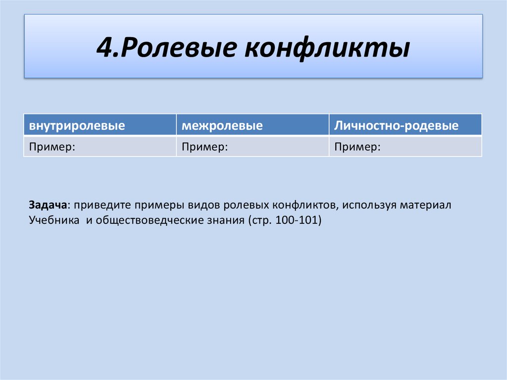 Задача: приведите примеры видов ролевых конфликтов, используя материал