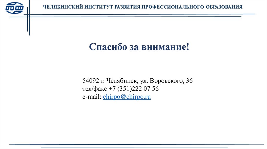 ЧЕЛЯБИНСКИЙ ИНСТИТУТ РАЗВИТИЯ ПРОФЕССИОНАЛЬНОГО ОБРАЗОВАНИЯСпасибо за внимание!