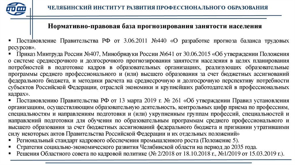 ЧЕЛЯБИНСКИЙ ИНСТИТУТ РАЗВИТИЯ ПРОФЕССИОНАЛЬНОГО ОБРАЗОВАНИЯНормативно-правовая база прогнозирования занятости населения