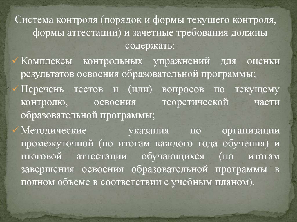 Система контроля (порядок и формы текущего контроля,формы аттестации) и зачетные требования должны