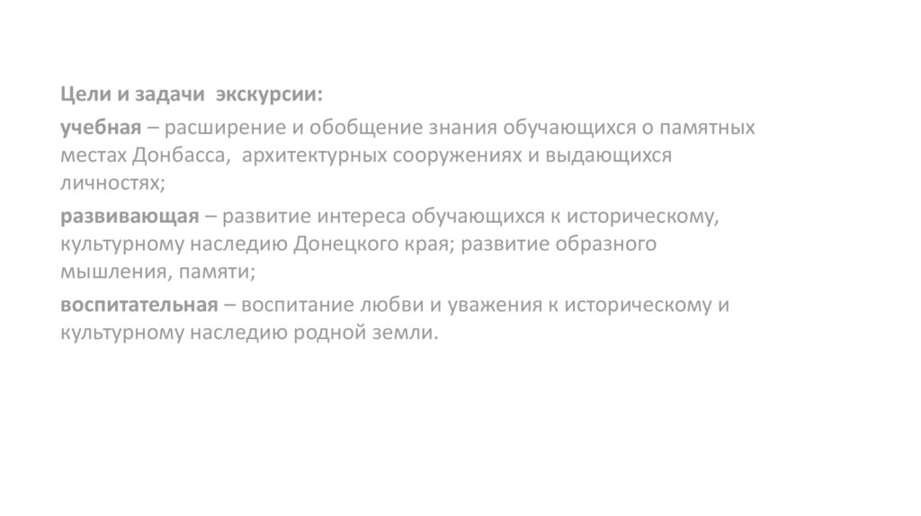 Цели и задачи экскурсии:учебная – расширение и обобщение знания обучающихся о памятных