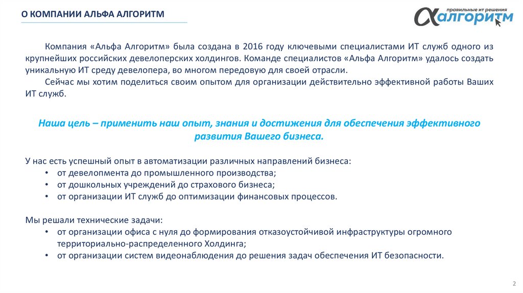 О КОМПАНИИ АЛЬФА АЛГОРИТМКомпания «Альфа Алгоритм» была создана в 2016 году ключевыми специалистами ИТ служб одного из
