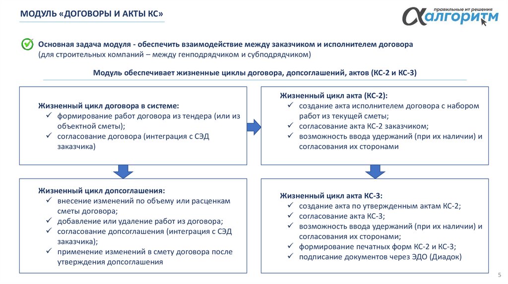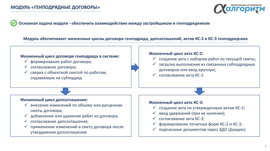 Модуль обеспечивает жизненные циклы договора генподряда, допсоглашений, актов КС-2 и КС-3 генподрядчика