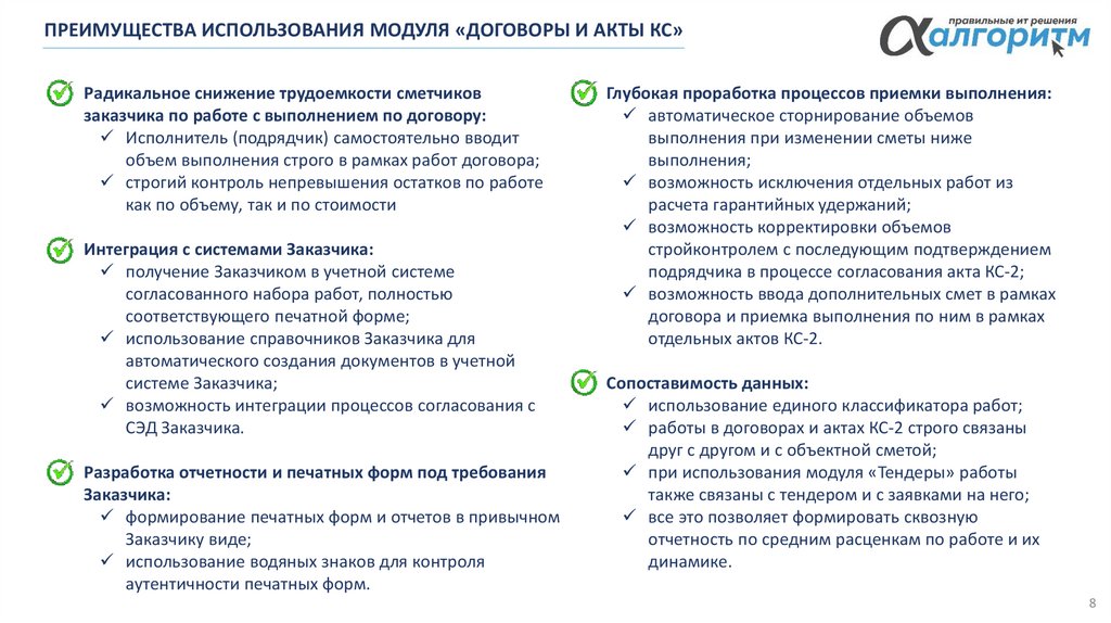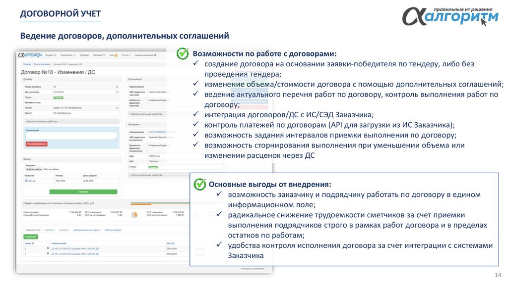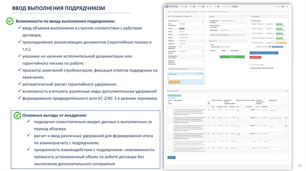 автоматизирует приемку выполнения по работам договоров, а также позволяет привлекать с