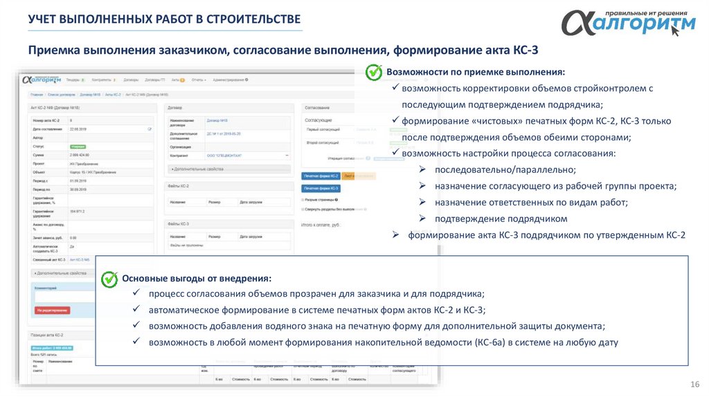 - согласование актов КС-2 и КС-3 заказчиком, возможность корректировки объемов стройконтролем
