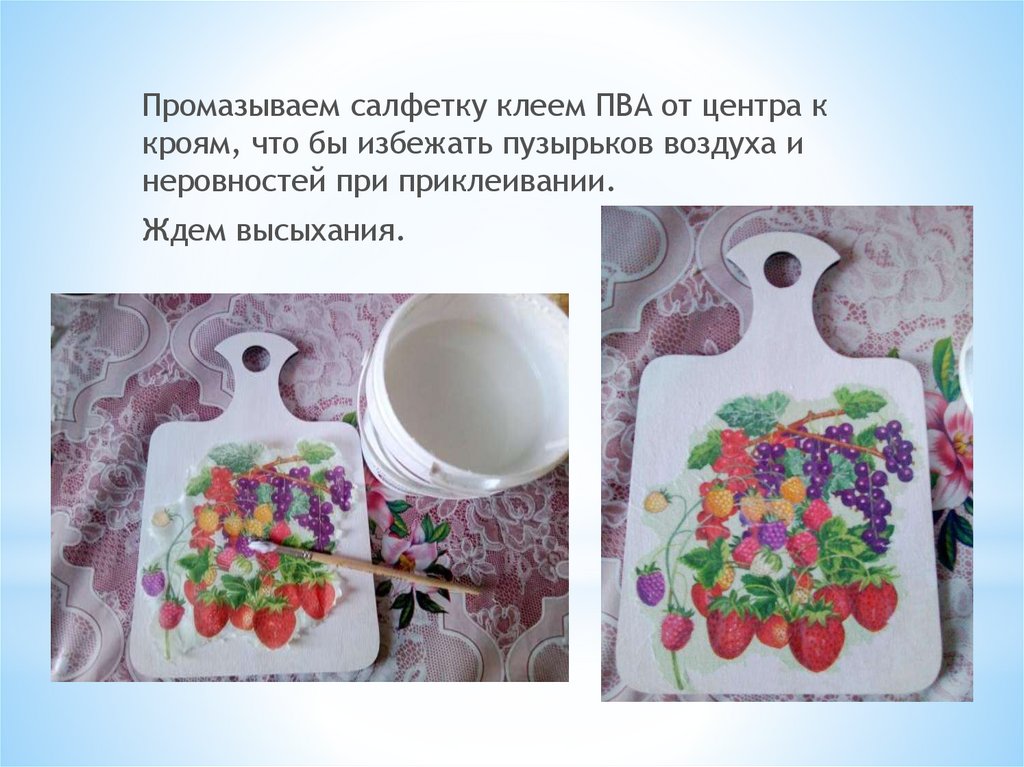Промазываем салфетку клеем ПВА от центра ккроям, что бы избежать пузырьков воздуха и
