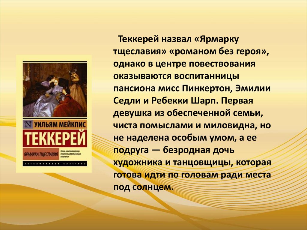 Теккерей назвал «Ярмаркутщеславия» «романом без героя»,