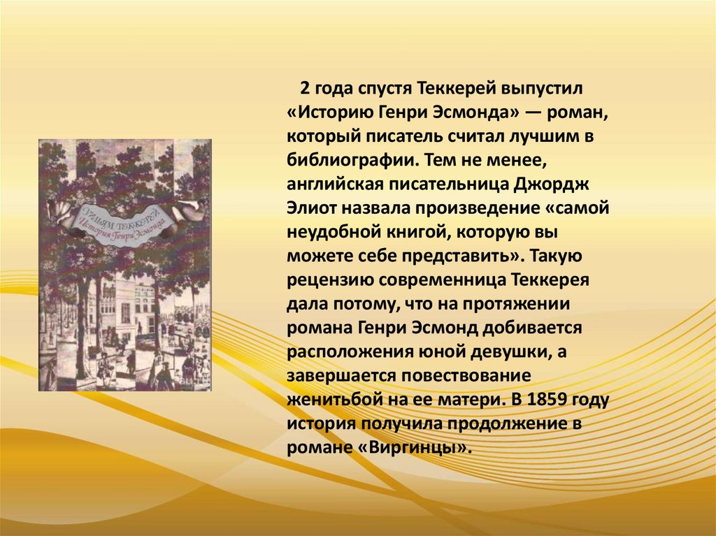 2 года спустя Теккерей выпустил«Историю Генри Эсмонда» — роман,