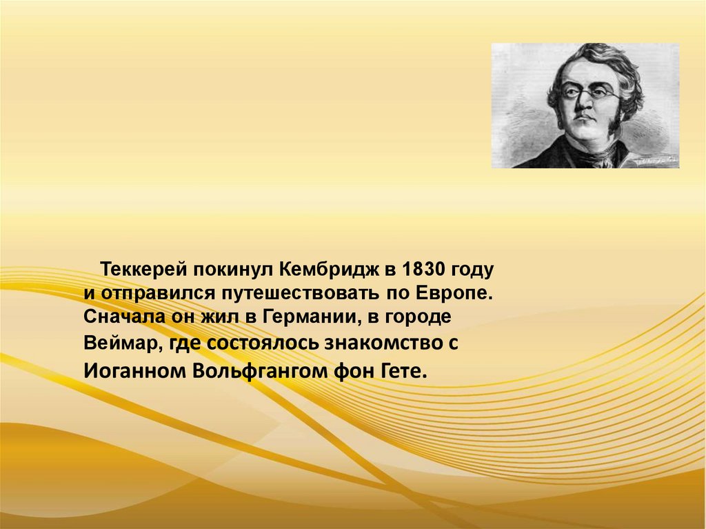 Теккерей покинул Кембридж в 1830 годуи отправился путешествовать по Европе.