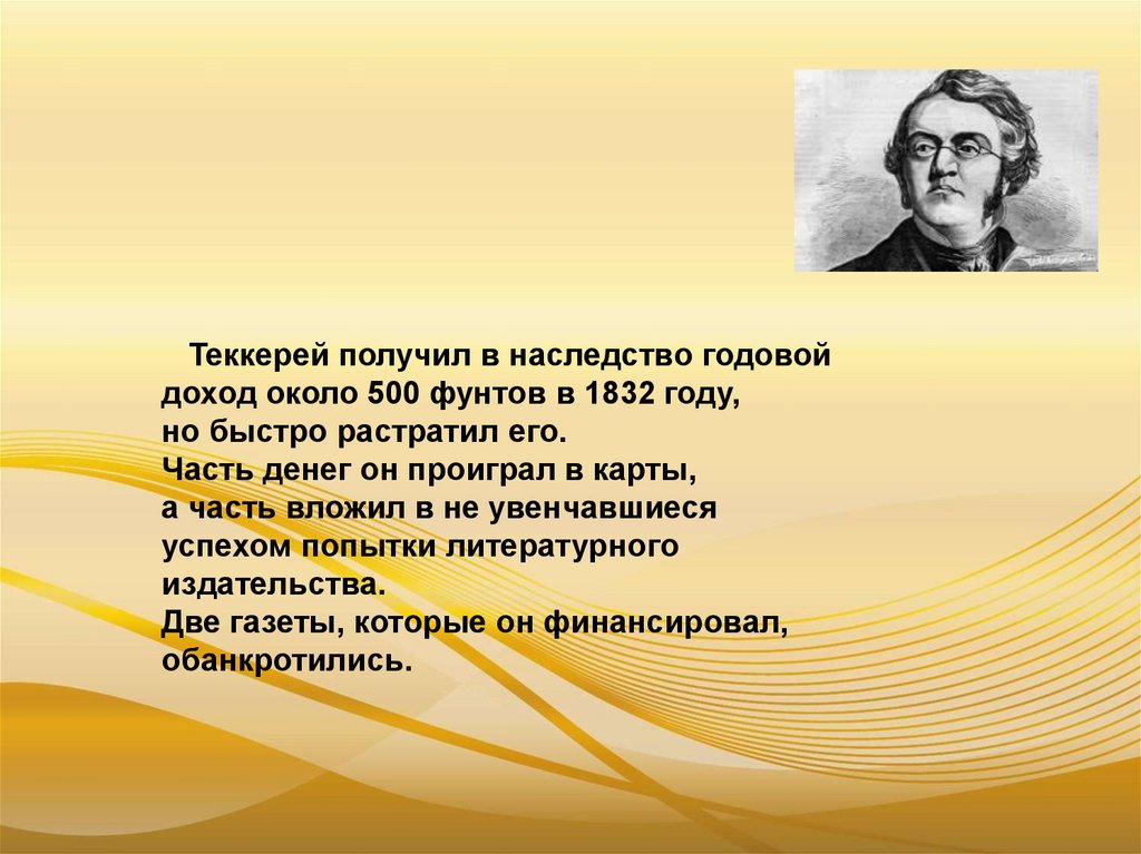 Теккерей получил в наследство годовойдоход около 500 фунтов в 1832 году,