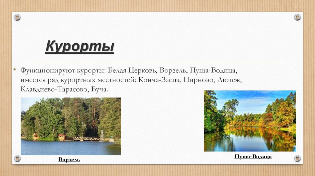 Курорты• Функционируют курорты: Белая Церковь, Ворзель, Пуща-Водица,
