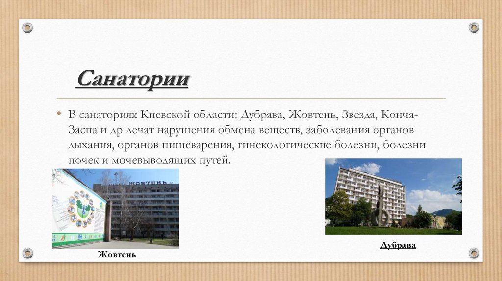 Санатории• В санаториях Киевской области: Дубрава, Жовтень, Звезда, КончаЗаспа и др лечат нарушения обмена веществ, заболевания органов